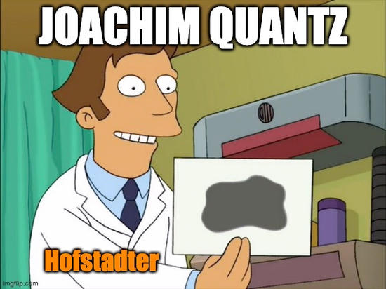 This limitation becomes particularly frustrating when Hofstadter builds an entire section around the subtle details of these artworks. For instance, in the Introduction chapter of Part I, when the author refers to "The Flute Concert" painting, he points out to Joachim Quantz -- "the figure furthest to the right" (leaning on the wall) which is basically a "greyish blob" in the printed version (Figure 1). The fascinating details of Menzel's painting (Figure 2) or the delicate shading in Escher's lithographs which are presented later throughout the book all lost in the poor printing quality. You constantly have to refer to external sources to understand their depth which most of the time is crucial to get the point the author is trying to make.